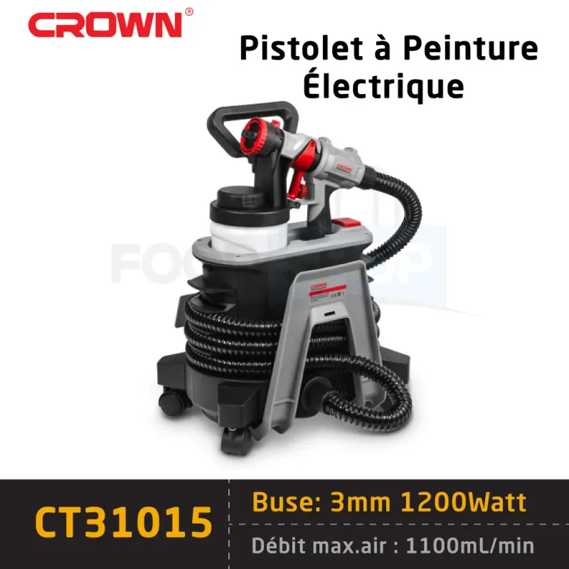 تعد شركة CROWN الأمريكية الرائدة في مجال الصناعة والمعدات الصناعية والحرفية واحدة من أفضل خمس شركات عالمية في هذا المجال، اكتسبت سمعة كبيرة كمبتكر عالمي وتلقت العديد من الجوائز الدولية، هذا لسعيها الدائم في دمج أحدث وأفضل التكنولوجيات في تصميم منتجاتها، مع اهتمامها بسلامة وصحة المستخدمين. Pistolet à peinture. Tuyau d'air. Entonnoir de mesure. Tige de nettoyage. Brosse de nettoyage. Buse 2 pieces. Bague d'étanchéité 2 pieces. Clé spéciale pour buse de pulvérisation. Support de tuyau. Puissance nominale: 1200 W. Ampérage à la tension 220-230 V: 4,5 A. Débit: 1100 ml / min. pression de pulvérisation: 0,1 - 0,3 bar. viscosité: 150 DIN-s. Buse Ø: 2 / 2,5 / 3 mm. Capacité du reservoir: 900 ml. Poids: 5,1 kilogrammes.
