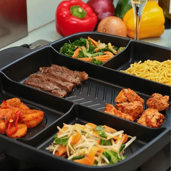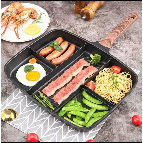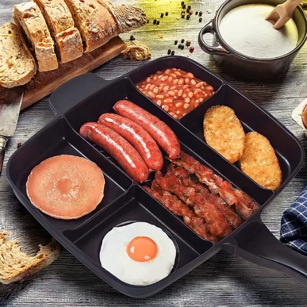 فطورك جاهز بكل محتوياته في 5 دقائق فطورك أصبح سهل التحضير والتجهيز ولن يستغرق وقتًا ولا مجهود ولا الكثير من الأواني قم بطهي مجموعة متنوعة من الأطباق اللذيذة في مقلاة واحدة مقسمة الى خمسة أقسام مثالية لوجبة إفطار غنية ، مصنوعة من الألومنيوم لأداء قوي وطويل الأمد. الجزء الداخلي غير لاصق بالكامل مما يجعل المقلاة سهلة للغاية ومريحة للتنظيف. تستفيد المقلاة من مقبض مصمم هندسيًا مع قبضة ناعمة للاستخدام المريح